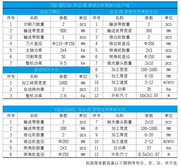 主要用途及性能: 该生产线的主要特点:由前后刀切割机一台,自动转向平台2套,加双边45度倒角抛光机二台来组成,为我厂经过最新研究、设计、制造出的最新抛光机生产线。 该生产线的性能特点: 1、有双边加工的性能,如600×600至1000×1000的瓷砖进行一次性切割成一分为二,并同时单、双边45度倒角抛光而成。此功能大大的提高了生产效率,且也最大限度的节约了人工成本; 2、另外它操作方便、加工速度快、加工效果好,是众多深加工客户致富的首选产品。