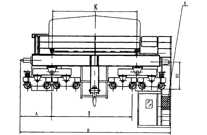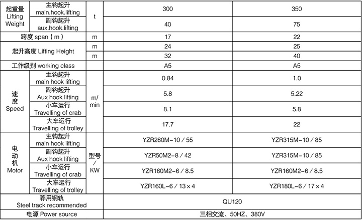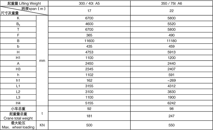 吊钩桥式起重机300/40t 17m 350/75t 22m1、电气 2、小车 3、大车 4、桥架 5、大车导电架 6、司机室保护网