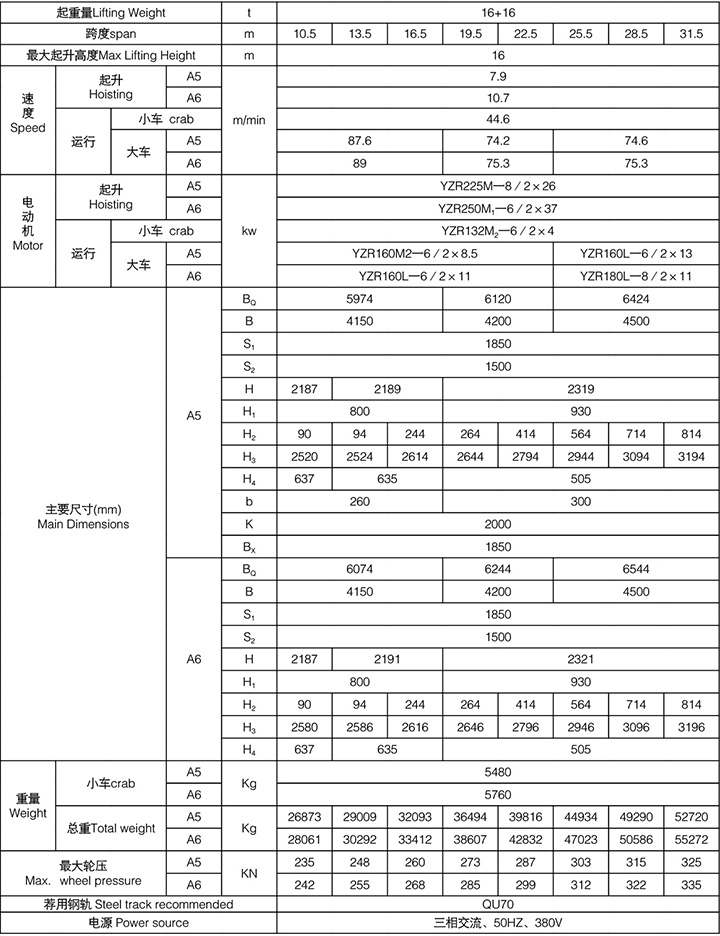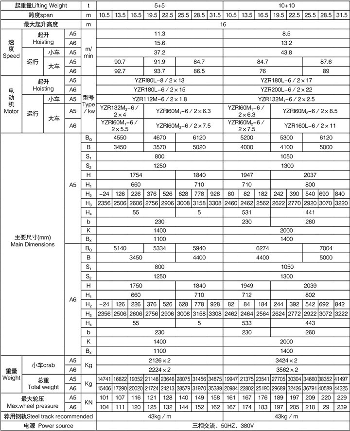 本起重机有两台小车,两小车可以同时使用,也可以单独使用,适用于厂矿企业的车间或露天仓库吊运长件材料(木材,纸筒,管封,棒材)。 注: 1.大车导电有角钢和安全滑触线两种形式,供选择。 2.操纵形式有室操(分开式和闭式),地操和遥控三种,供选择。